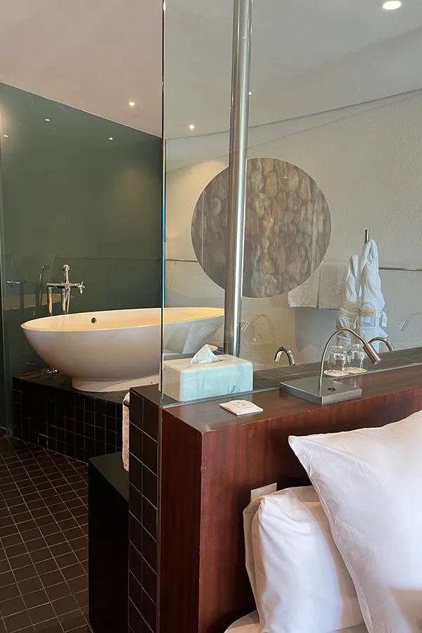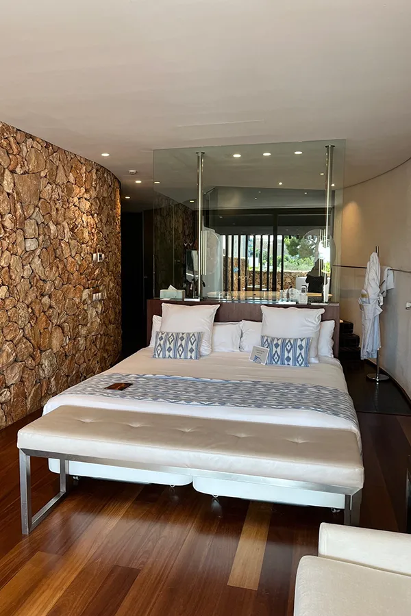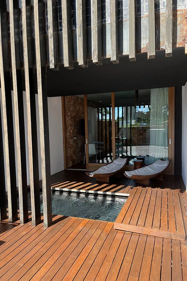 The hotel features 51 bedrooms in total – 29 in the main Palacio building and 22 in the Natura building, which is accessed via a cleverly landscaped walkway. The bedrooms in the Palacio are elegant and chic and the Natura bedrooms feature open brick walls and Zen pools on their balconies/terraces – luxury guaranteed whichever room type you choose.